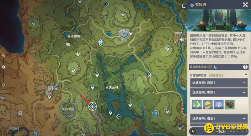 通关炼武秘境:思惑就可以获得绿洲花园的追忆。在每周的周二、周五以及周日进入水天丛林左下角的有顶塔秘境就可以进入炼武秘境:思惑,通关炼武秘境:思惑后就有几率获得绿洲花园的追忆。