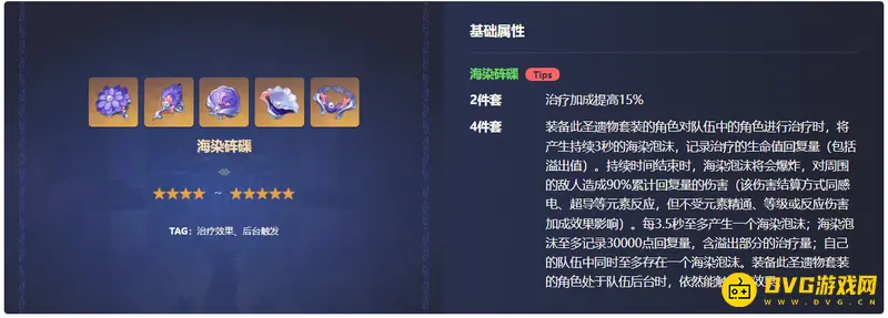 海染砗磲产生持续3秒的海染泡沫,每3.5秒至多产生1个。记录治疗的生命值,并在持续时间结束时对场上角色周围敌人造成伤害,实际效果是海染泡沫会跟随场上角色移动而移动。