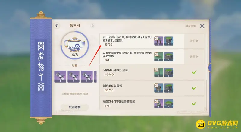 2、在洞天宝鉴的第三回中有一个放置20个乔木或灌木类摆设的任务。