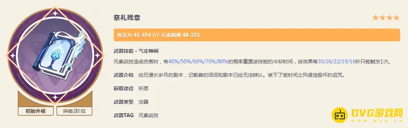 选择祭礼残章,祭礼残章拥有四星级别法器里高达221点元素精通副属性,可惜武器特效对于元素战技「所闻遍计」极短的冷却时间没什么作用,因此仅需精1即可,不需要精炼。