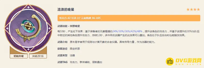 选择流浪的晚星,流浪的晚星满级副属性165点元素精通,武器特效能为全队提高攻击力,适合与受攻击力加成的伤害输出角色组队时装备。