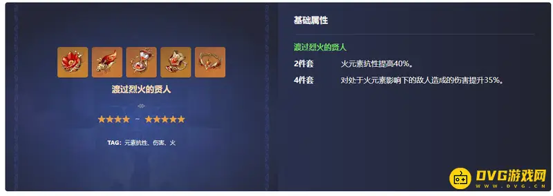 1.渡过烈火的贤人2件套效果为提高40%火元素抗性,火元素抗性用处不大,4件套效果为对处于火元素影响下的敌人造成的伤害提升35%,伤害提升倒不错。不过渡火套只适合一些特殊角色,如核爆的行秋。
