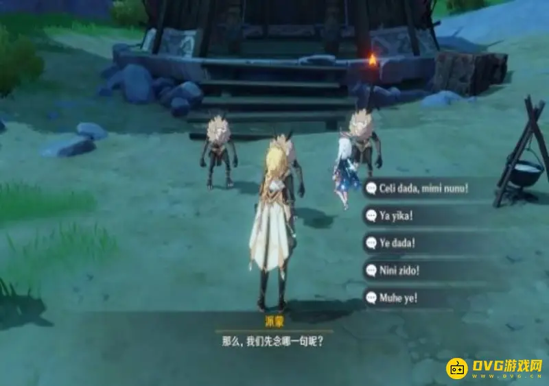 2、根据提示和丘丘人语研究学家艾拉对话,获得存疑的丘丘人语单句道具,找丘丘人交流诗歌。