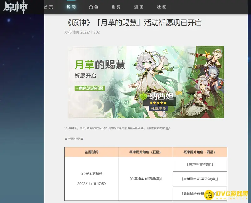 1、3.2版本第一期卡池的开启时间是在3.2版本更新后,也就是2022年11月2号的中午11:00正式开启3.2版本第一期卡池,一直到2022年11月18号下午17:59分关闭,第一期卡池中包含了五星角色纳西妲以及宵宫,还有她们的专武千夜浮梦和飞雷之弦振。