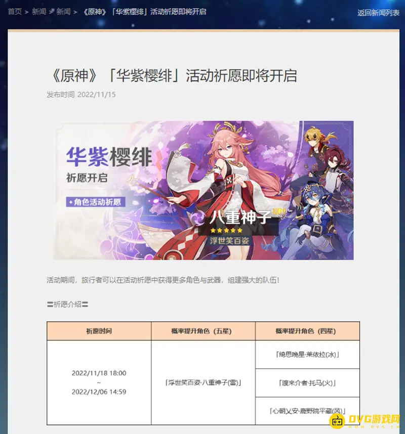 2、第二期卡池的开启时间是2022年11月18号下午18:00,结束时间是2022年12月6号下午14:59分,第二期卡池中包含了五星角色八重神子和达达利亚,还有他们的专武神乐之真意和冬极白星。