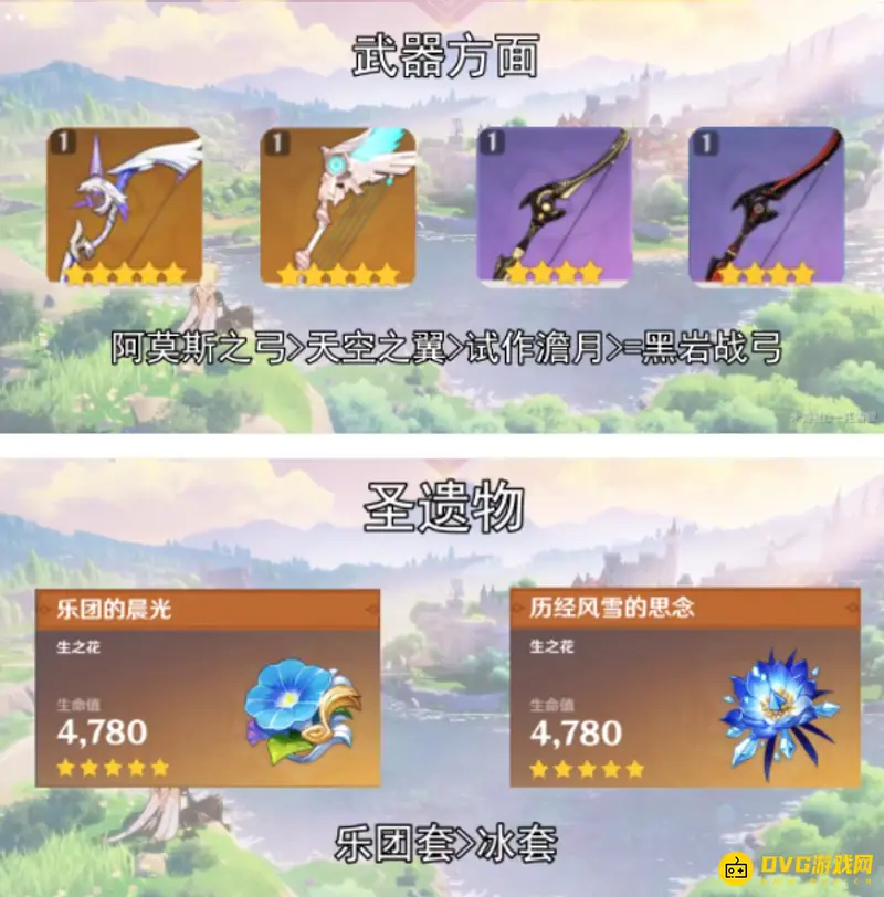 首先武器推荐是阿莫斯之弓(下位可用天空替代),圣遗物推荐两套,分别是流浪大地乐团套(融甘体系)和冰套(永冻体系)。不同队伍体系的圣遗物要求不同。