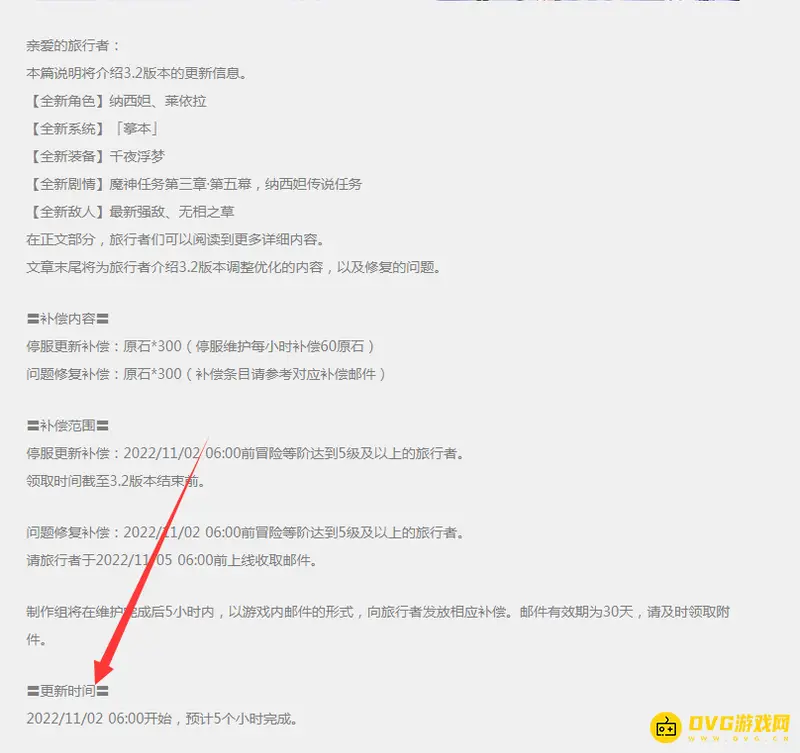 原神3.2版本更新时间是2022/11/02 06:00开始,预计5个小时完成。游戏更新后,玩家将领取共计600原石的停服更新、问题修复补偿。