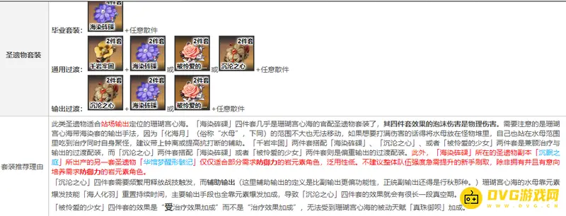 「千岩牢固」两件套搭配「海染砗磲」、「沉沦之心」、或者「被怜爱的少女」两件套是兼顾治疗与输出的过渡配装,而「沉沦之心」两件套搭配「海染砗磲」或者「被怜爱的少女」两件套则是偏重输出的过渡配装。