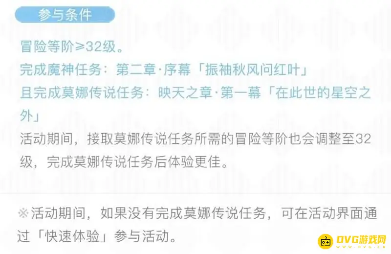 活动时间开启时间:2022.7.15 10:00-至2.8版本结束,参与条件:冒险等级≥32级,完成魔神任务:第二章·序幕「振袖秋风问红叶」且完成莫娜传说任务:映天之章·第一幕「在此世的星空之外」。