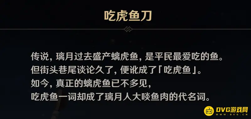 第二处则是螭虎以及其衍生出来的螭虎岩、吃虎岩、烤吃虎鱼、烤螭虎鱼和吃虎鱼刀。注意这里吃虎鱼的吃并不算是错字,璃月过去盛产螭虎鱼,是平民最爱的鱼,但后来逐渐稀有。