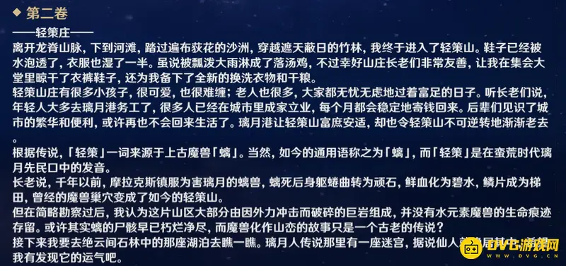 游戏内与螭相关的事物有两处。第一处是璃月轻策庄附近的世界任务古云有「螭」。在冒险家罗尔德的日志第二章中,我们可以阅读到相关内容。