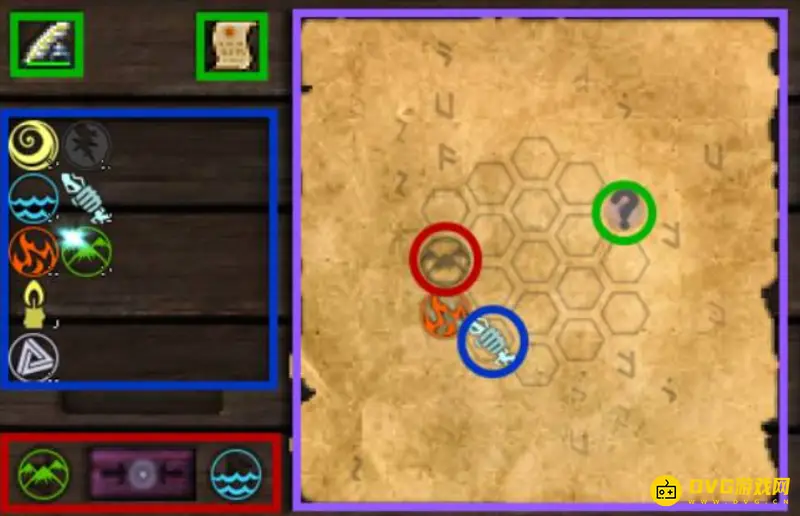 13.点击研究台,就能打开它的研究界面了。左上角的绿色正方形:这里放笔与墨。中间的绿色正方形:这里放研究笔记。蓝色长方形:这里表示各元素研究点数的数量。