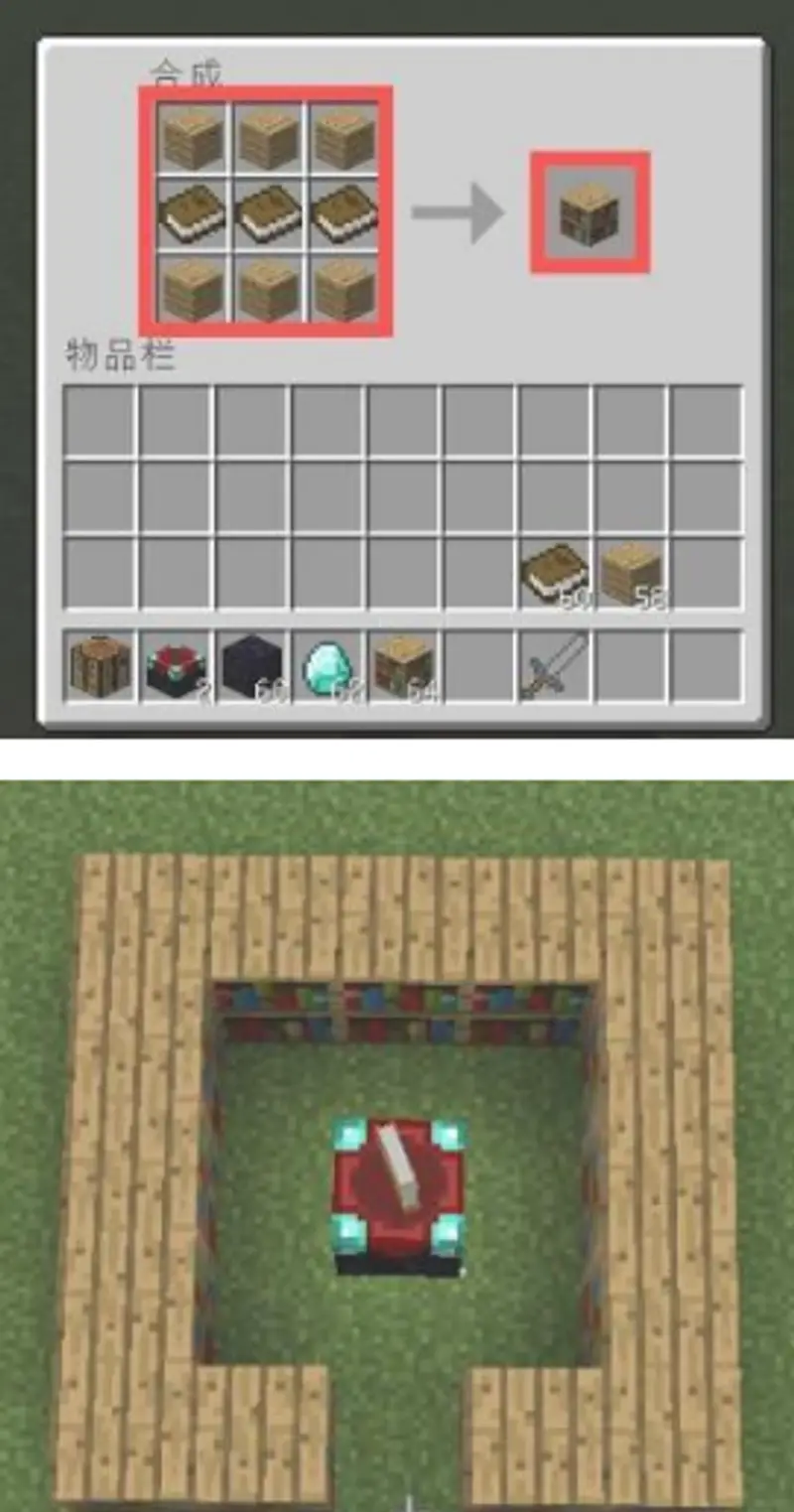 2.接着玩家用6个木板和3本书合成书架并放在附魔台旁边,可以增加附魔台的效果,最高可以放置15个书架来提升和附魔台