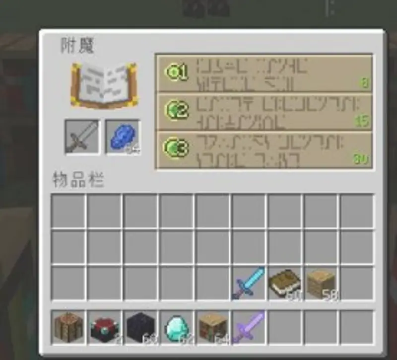 3.最后玩家点开被书架包围的附魔台,放入石剑和青金石或者其他宝石,即可完成附魔。