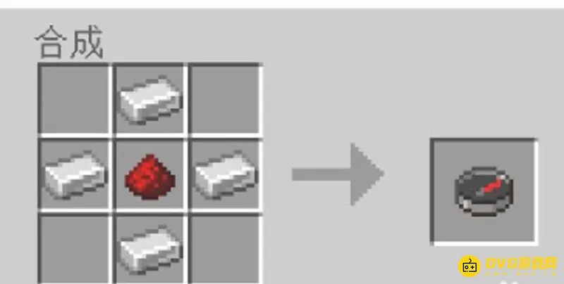 4、得到红石和铁锭后如图摆放就可以得到指南针了。4个铁锭 1个红石;红石放最中间,旁边四个方向各放一个铁锭。