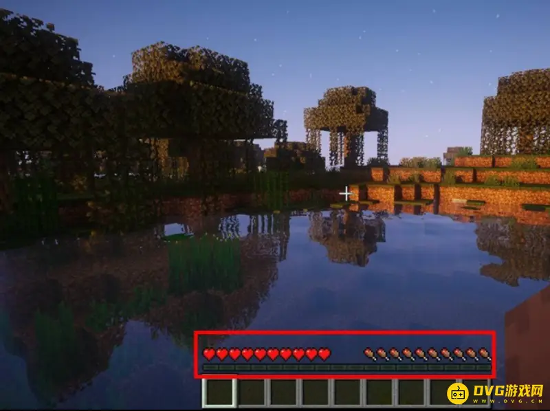 2、进入游戏,有生命条和饥饿条,显示开启了作弊的生存模式
