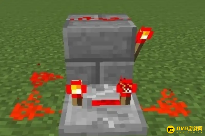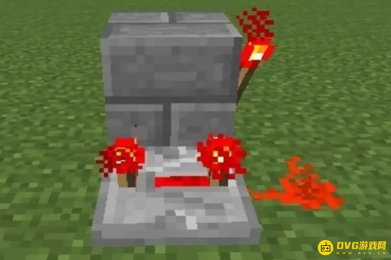 1.在平地放置一块方块,在方块的右侧插上红石火把。