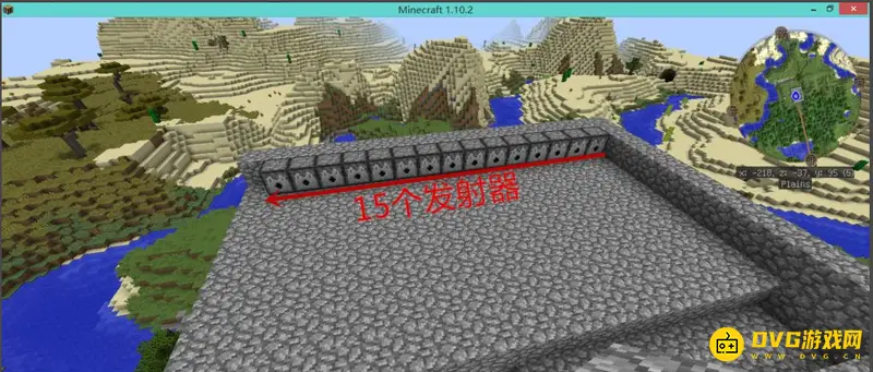 7、然后铺红石电路(如图,因为红石只能传播电能的最长距离是15格,所以我们用15个发射器,超过十五格的用中继器充能)