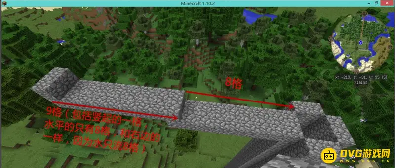 3、垒到22层左右(怪物23-24层摔死)往一个方向搭8*2的平台如图。注意在我的世界里水只流动八格,所以我们搭八格。