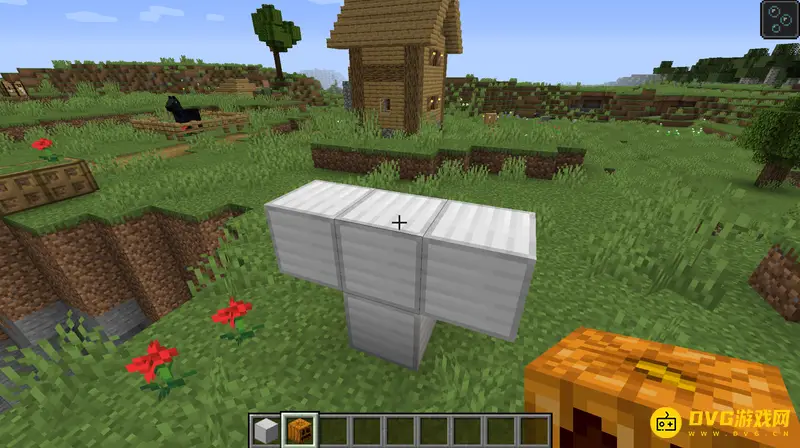 2、然后拿出准备好的南瓜头,放置在“T”字型中间的铁块上,可以看到铁傀儡已经生成了。