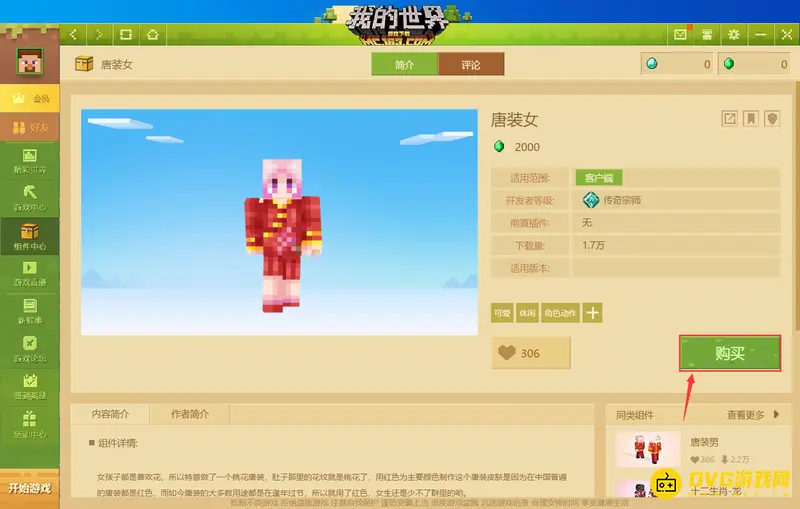 3.选择一个皮肤。选择好后在右下角点击“购买”按钮,购买完成之后,在左下角点击“开始游戏”按钮。进入游戏按“F5”可以看到皮肤已经修改。