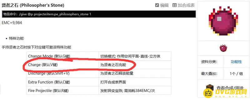 2,然后就可以在界面中发现贤者之石的充能方法为手拿贤者之石然后按住V键即可。