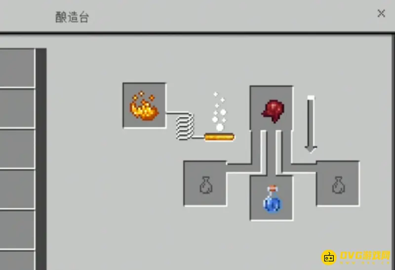 3、打开酿造台。往酿造台中放入发酵蛛眼和水瓶。接着加入燃料烈焰粉。