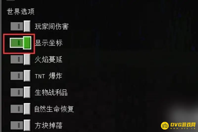 3、点击游戏,然后点击显示坐标前面的开关就可以看到坐标了。