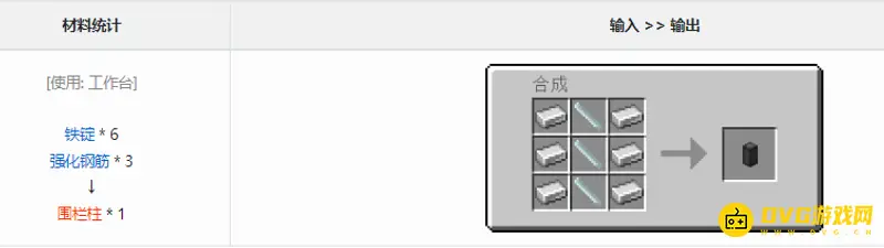 围栏柱需要通过工具台制作,消耗六份铁锭加上三份强化钢筋即可制作成一组围栏柱,摆放顺序如下图所示: