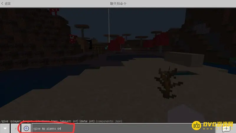 1,首先我们打开聊天框输入获取物品的指令/give @p,并输入木板的英文名planks。
