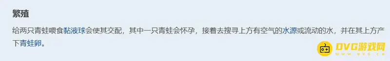 在我的世界里,玩家可以给两只青蛙喂食黏液球,使其交配。而其中一只青蛙就会怀孕,接着它会去搜寻上方有空气的水源或者流动的水,并在水上方产下青蛙卵。