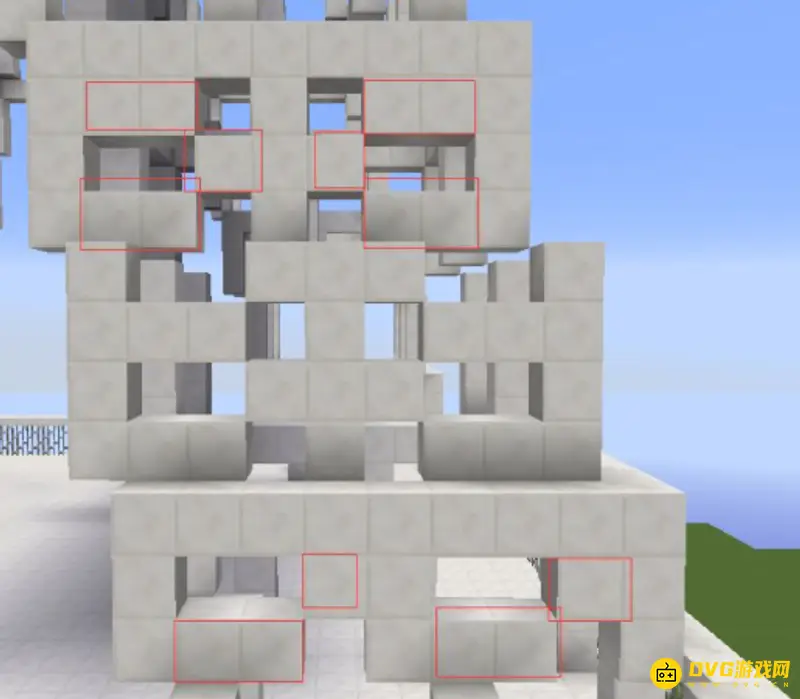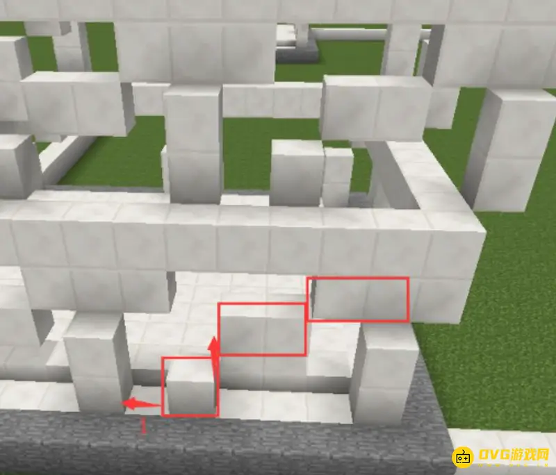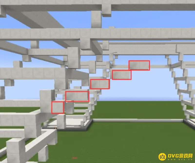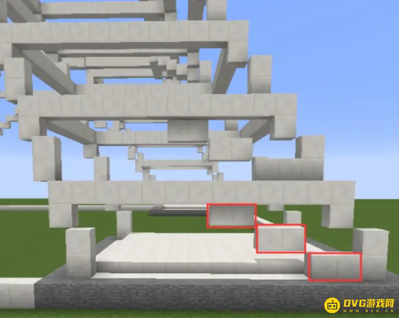 4、从底部开始每隔一层用石英块围起来,围的位置是两格高的石英块的最高那个;