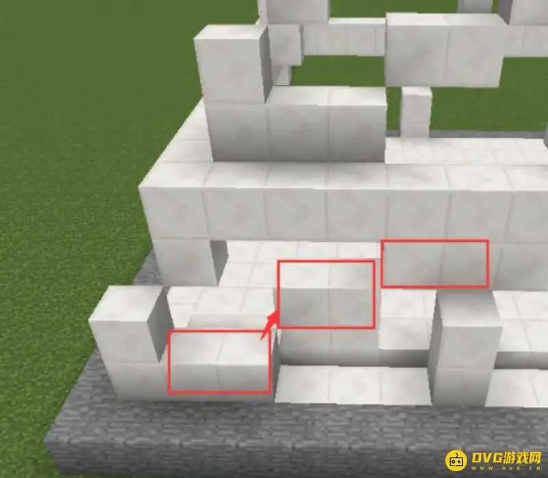 7、将最高层铺满石英块,向内收一格,再铺两格高的方块,再向外扩一格继续铺并且铺满;