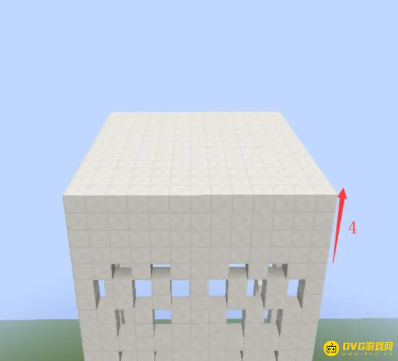 26、收一格,四个角先放一格方块,每隔5格放一格方块,提高48格,每隔5格围一圈;