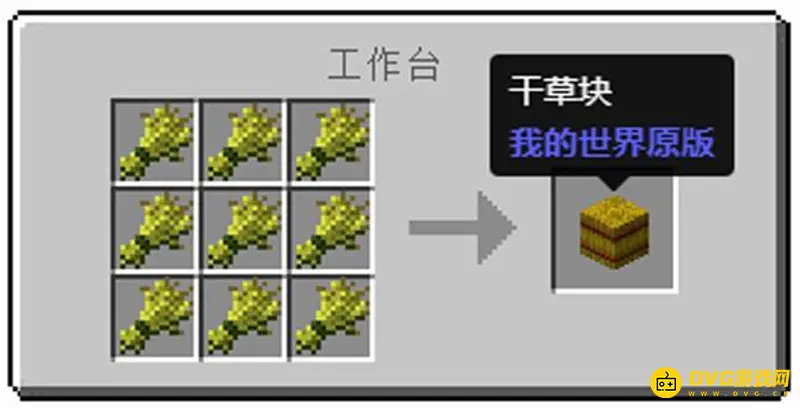 3、使用9个小麦在工作台上就能合成干草块,小麦可以通过种植获得。