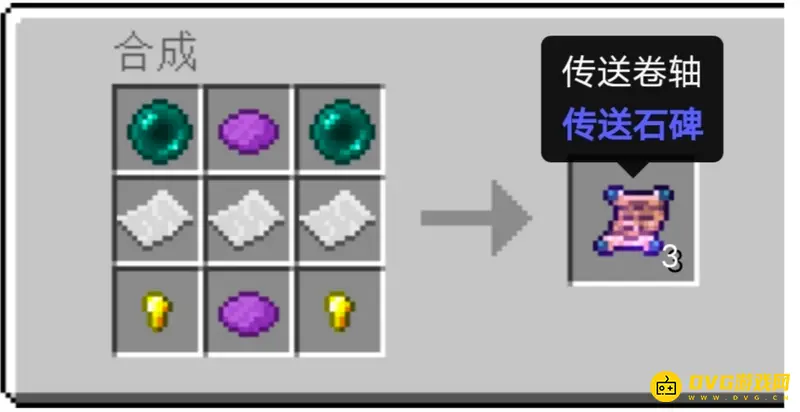 末影珍珠 * 2 紫色染料 * 2 纸 * 3 金粒 * 2=传送卷轴 * 3。一次性用品,可以进行跨世界传送(如从下界传送至主世界),可以实现跨世界传送所以受到玩家的喜欢。