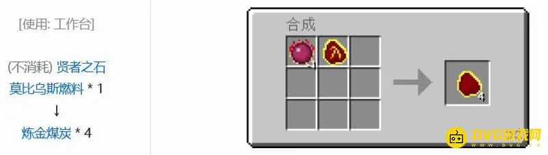 2.第2种方式是利用贤者之石和莫比乌斯燃料合成炼金煤炭,这样可以得到4个炼金煤炭。