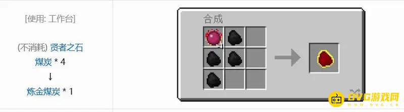 1.第1种合成方式是利用贤者之石和4个煤炭合成炼金煤炭,这样可以得到一个炼金煤炭。