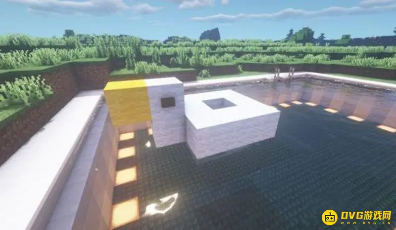 7、使用白色羊毛,黄色羊毛和深色橡木按钮做出一个可爱的鸭子泳圈。
