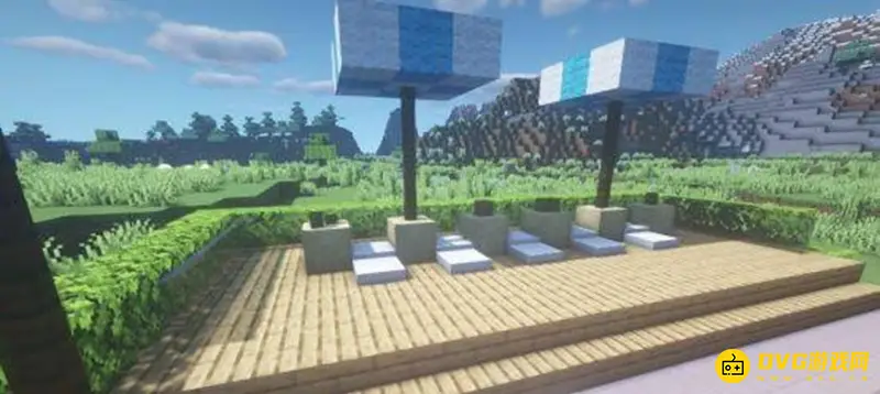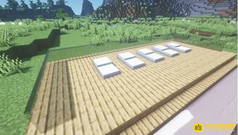 12、再使用去皮白桦木,海泡菜以及羊毛块做一些装饰,在外部围上一圈树叶作为点缀,这样一个能晒日光浴的露台就做好啦!从泳池里上岸就可以躺在这里休息,十分惬意呢!这样一个简单的泳池就完成啦!