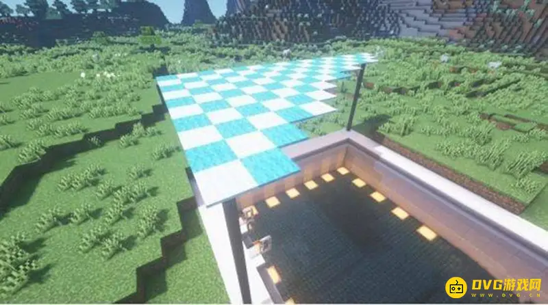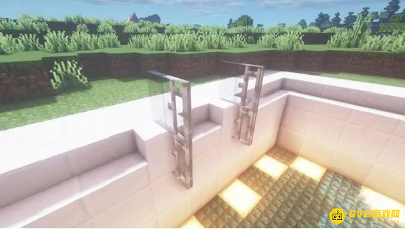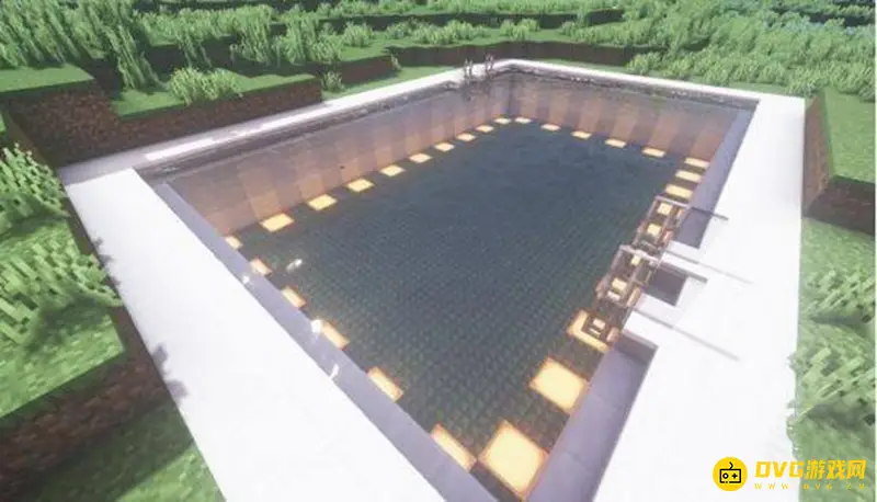 3、使用石英块和石英楼梯建造泳池的墙壁以及外围。