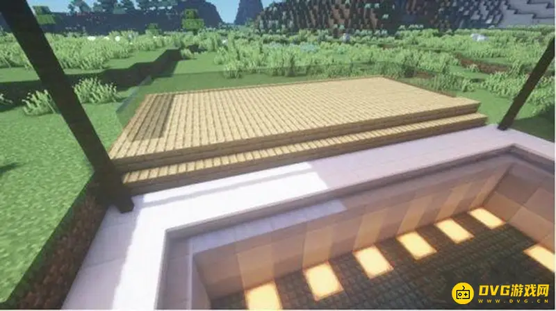 10、在泳池边上,用橡木木板,橡木楼梯和黑色玻璃板搭建一个平台。