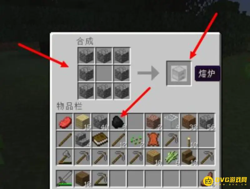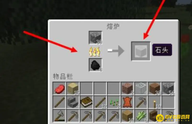 6.打开熔炉,把圆石和煤矿放进去,烧出石块,需要3个石块。