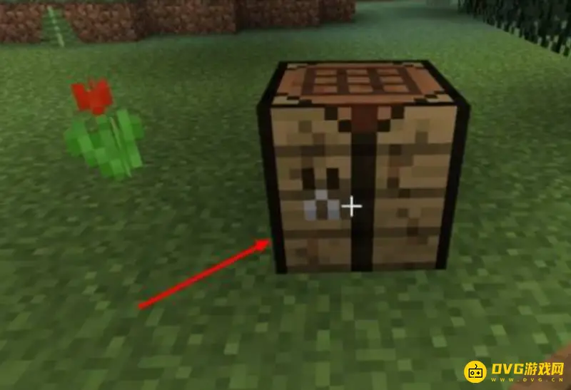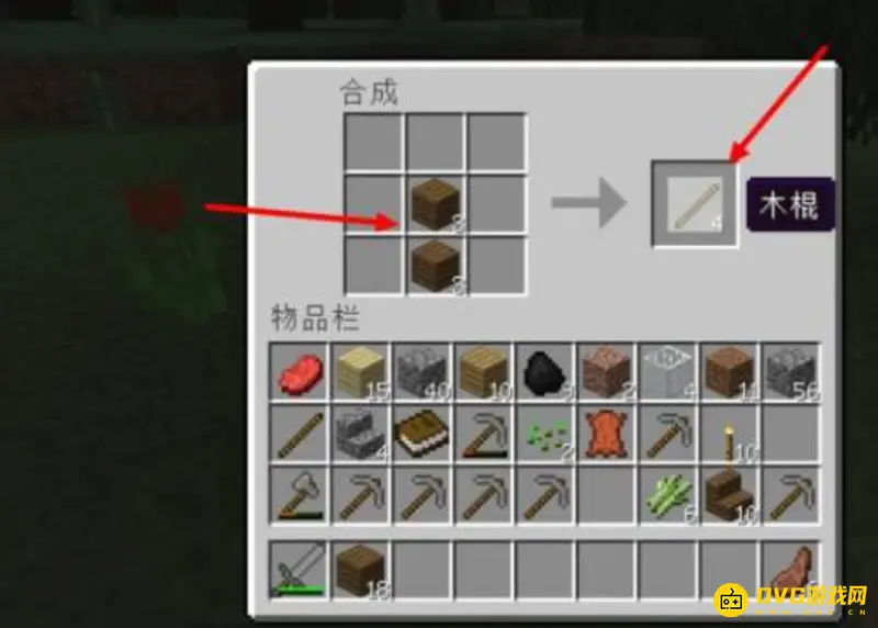 3.右键打开工作台,用2个木板按图中排列放进去获得木棍。