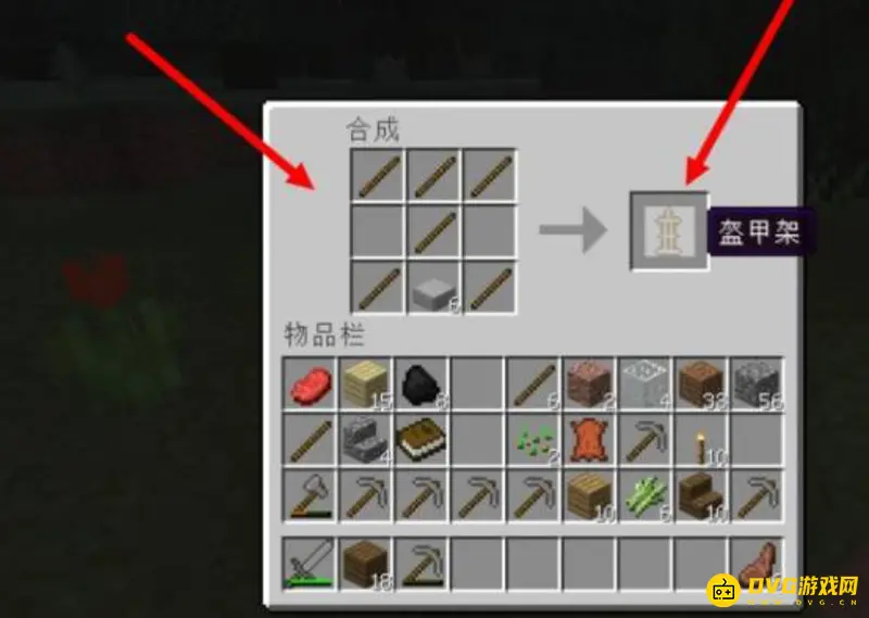 8.最后一步,把之前获得的木棍和石台阶再按图中放进工作台,就可以做出盔甲架了。