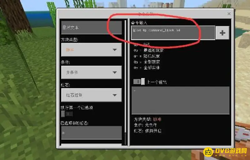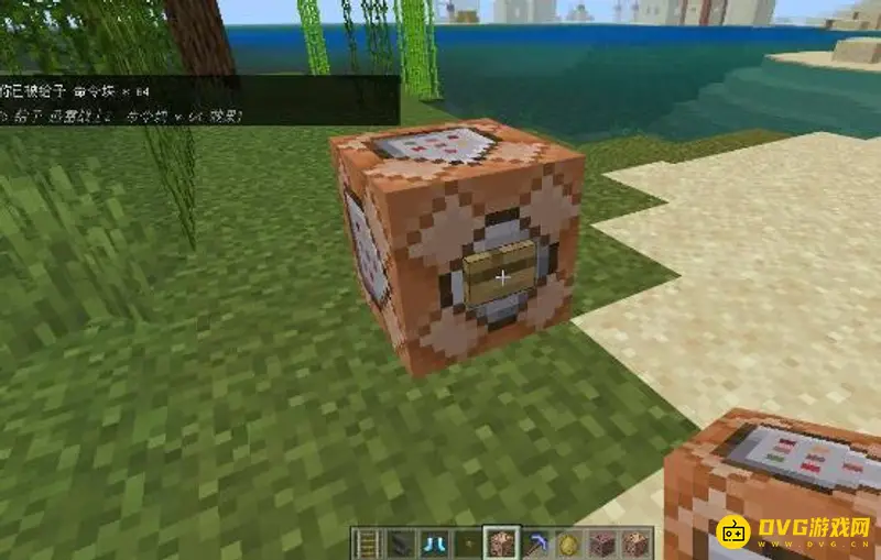 第二种方法是使用命令方块,我们使用指令/give @p minecraft:command_block 64获得命令方块,然后放置一个命令方块到地面上,接着我们打开命令方块输入指令。