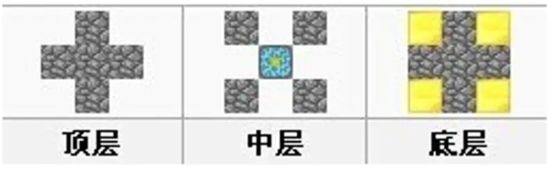 二、拆开来分析:底层用5个原石搭成十字,边角放4个金块。中层在四个金块正上方放置四个原石,中间放下界反应核。顶层放置5个原石搭成十字,如下图所示;
