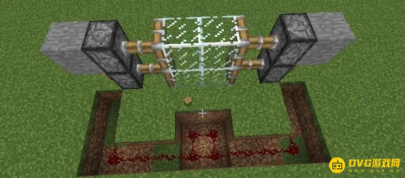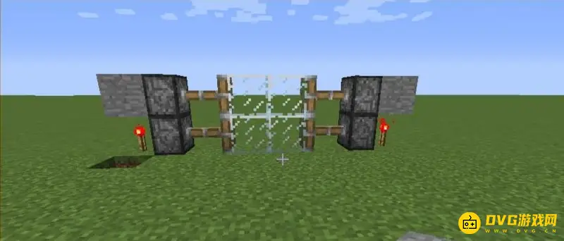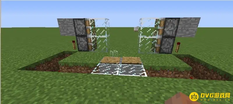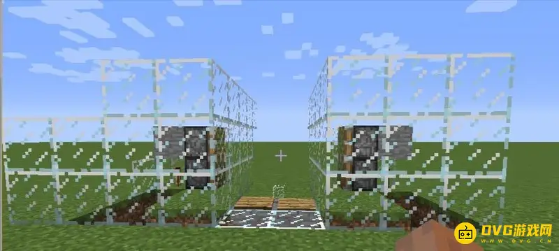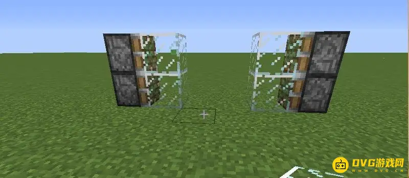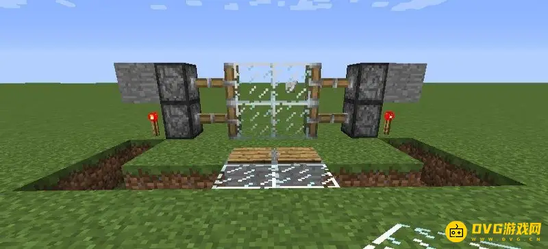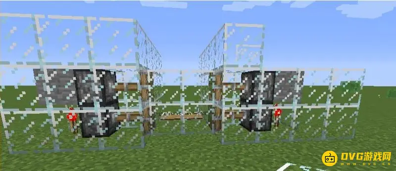 1、使用粘性活塞和玻璃,在地面上这样摆放,一共是占地六格。中间空两格作为活塞打开后玻璃门的位置。活塞位置朝里,前方放上玻璃。