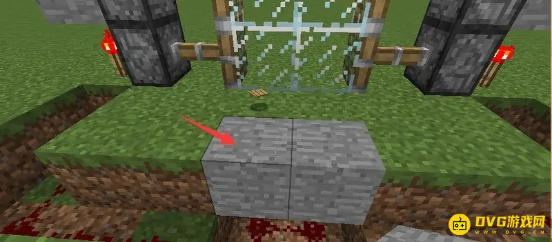2、接着在第一块活塞后面放上红色火把,然后在火把上方放置一块石头。注意一定是石头这样可以传导红石信号的方块。