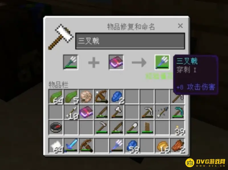 3、最后点击铁砧,在铁砧上放入三叉戟和相应的附魔书就可以成功修复了